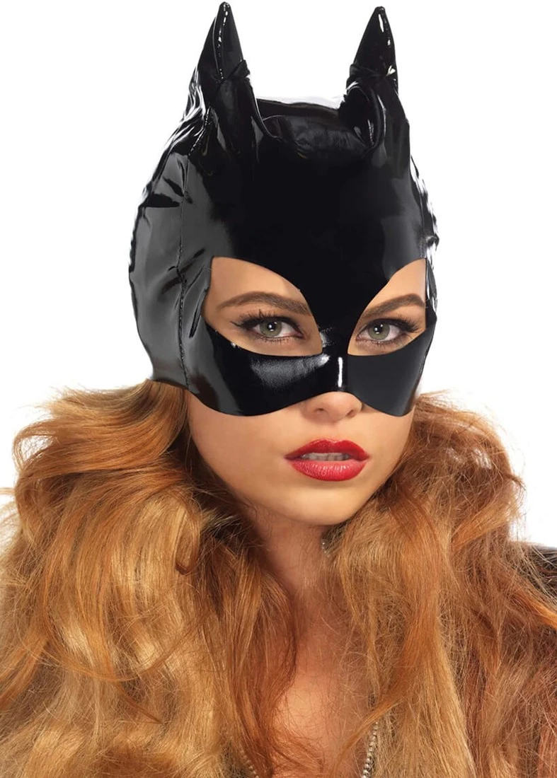 Een mooie catwoman masker welke die wetlook heeft. Het masker heeft schuine oogopeningen en puntige oren.