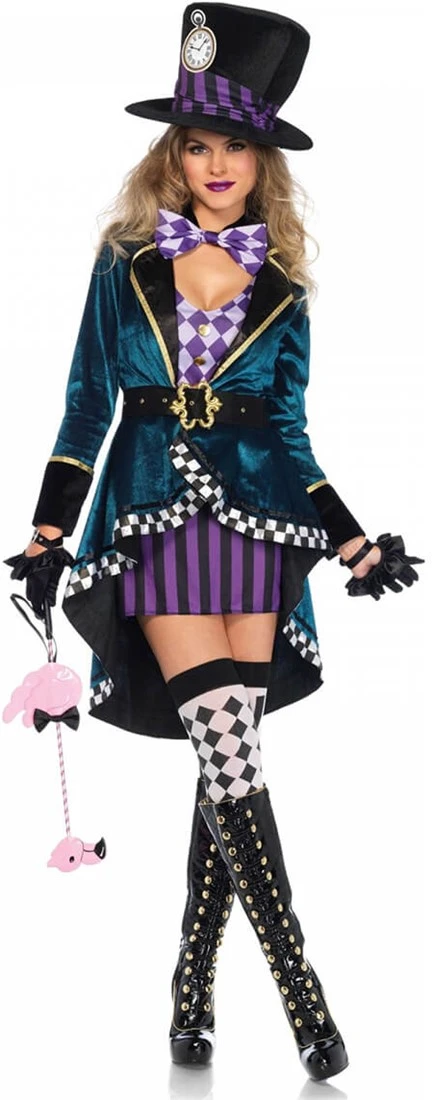 Details: fluwelen jasjurk met meerdere prints en een vast vest, een bijpassende vlinderdas, een riem en een heerlijke gekke hoedenmuts met klokdetail.