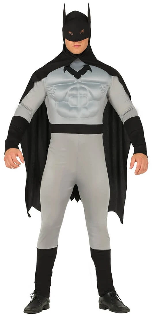 Details: cape en masker is één geheel. Het borstgedeelte is opgevuld zodat het lijkt alsof je heel gespierd bent
