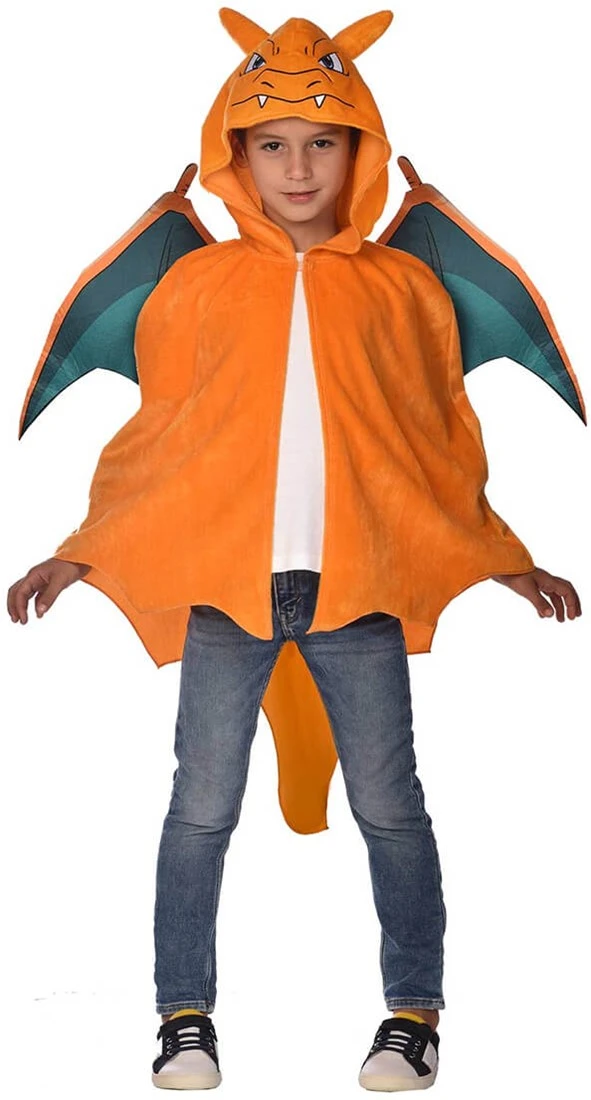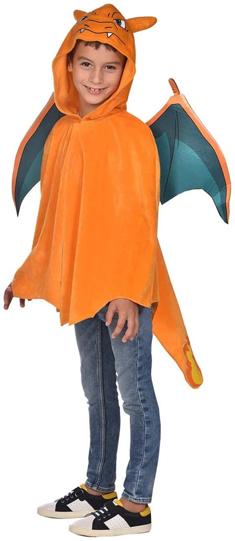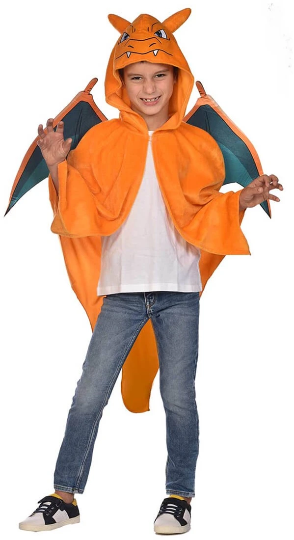 Details cape: een effen kleurige cape met op de achterkant een vlam op de staart. Op de capuchon zit het gezicht en oren van chariard