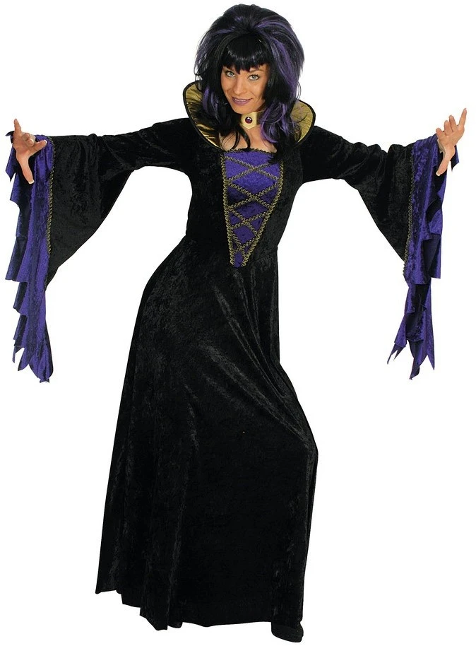 Een prachtige jurk die gemaakt is van pannesamt en daardoor erg zacht aanvoelt. De jurk heeft paarse tinten en goudkleurige details. Uitstekend te gebruiken als dracula- of heksenjurk.