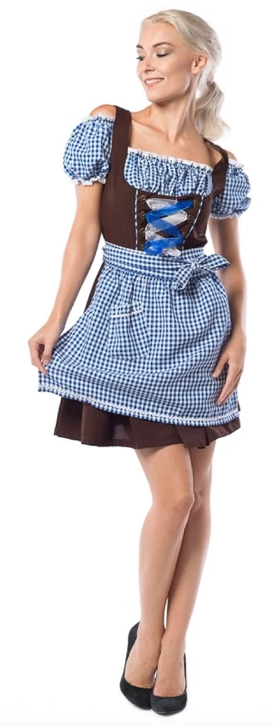 De mooie 2 delige Dirndl Anne-Ruth bestaande uit een jurk en een schort. De bruine jurk is voorzien van blauwe en wit geblokte stukken, net zoals het bijpassende schort, bij de borst en mouwen. Verder zit er aan de voorkant van de jurk een blauw met witte lint. Deze lintjes zijn doorzichtig en zitten aan metalen hartjes.