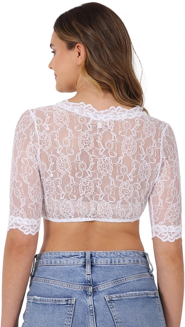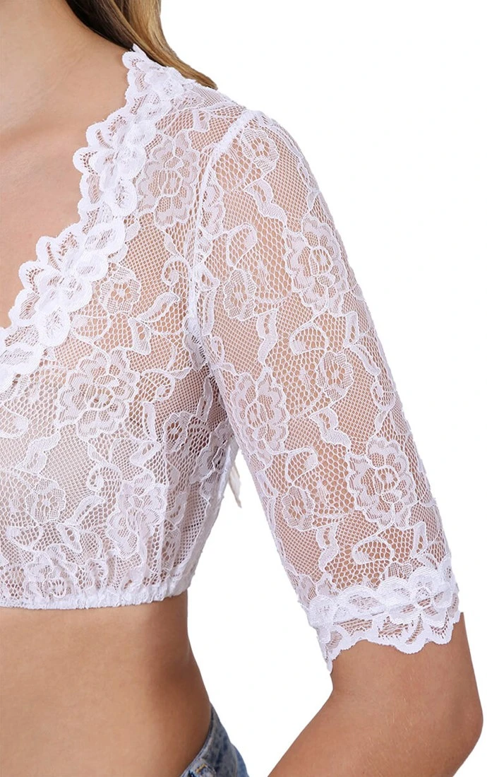Details: transparant kant met versieringen op de V halslijn om het decolleté benadrukken en half lange mouwen