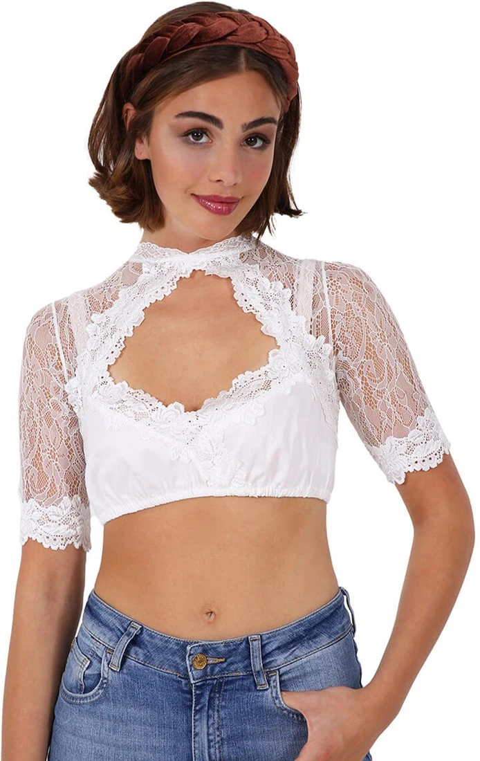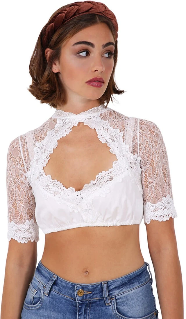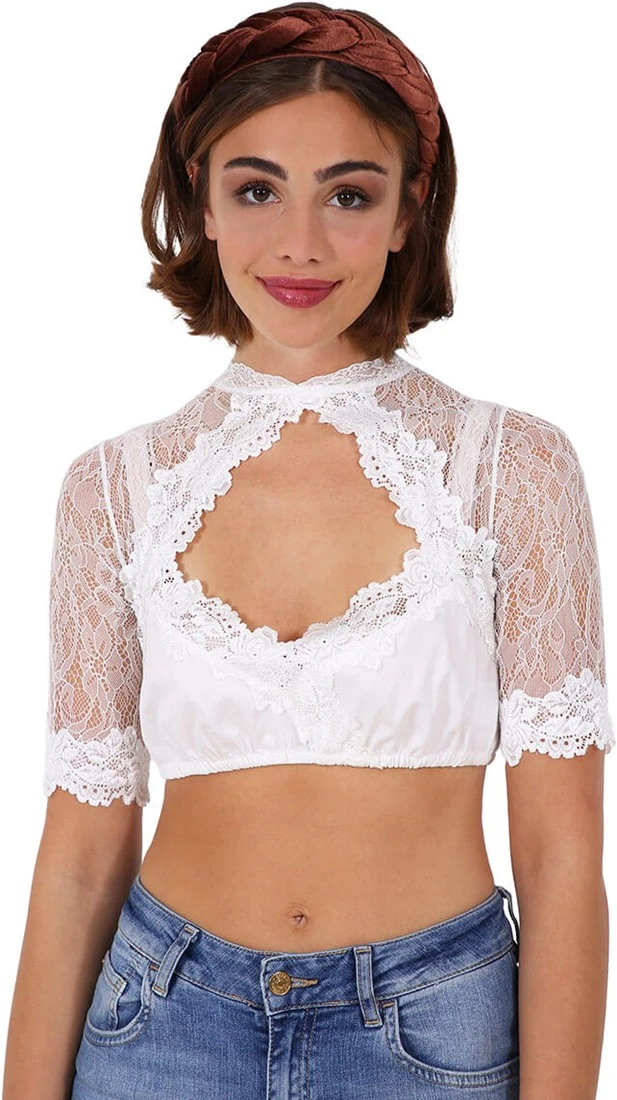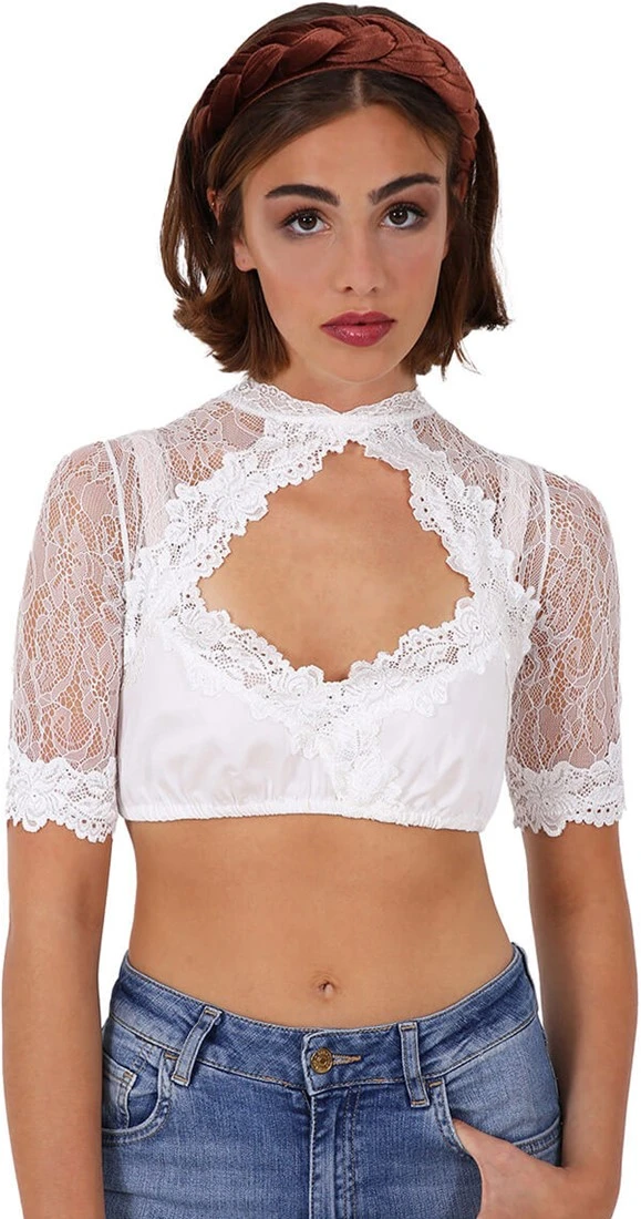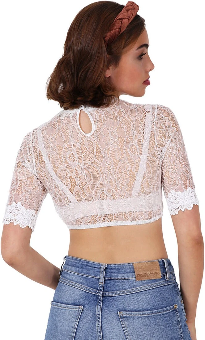 Details: fijn kant, korte mouwen en een klein kraagje. De hart vormige halslijn is zeer opvallend en vestigt de aandacht op het decolleté