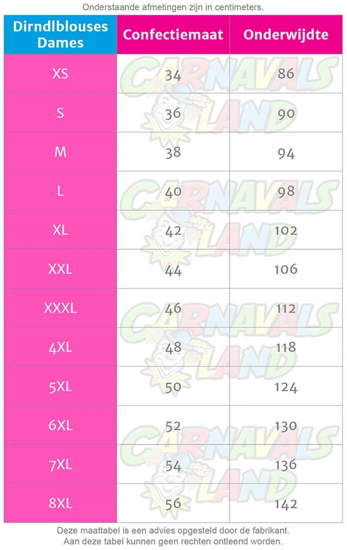 | Dames confectie | 36 = S, 38 = M, 40 = L, 42 = XL, 44 = XXL, 46 = 3XL |