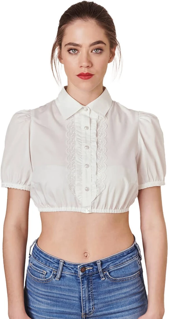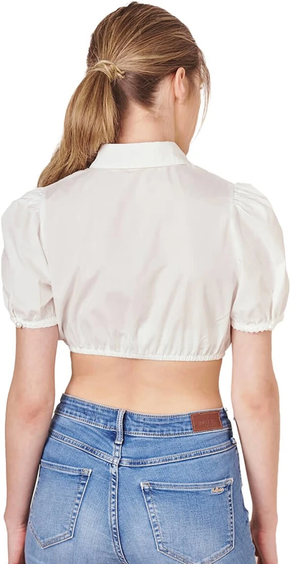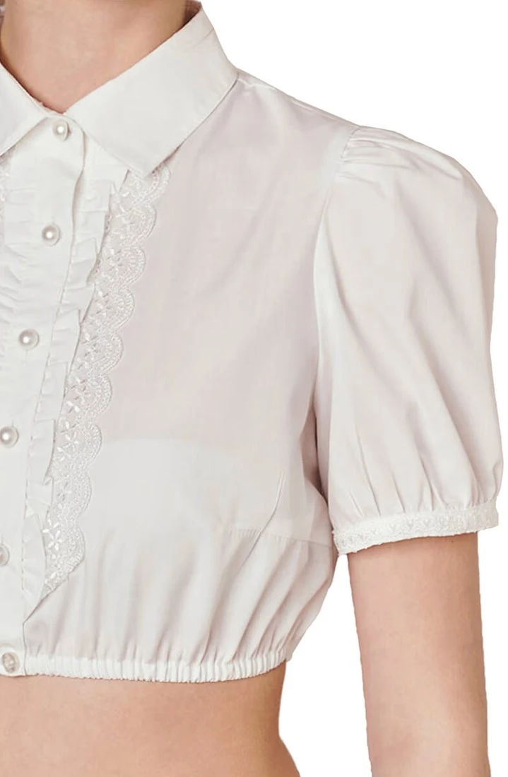 Details: hoog gesloten en korte pof mouwen. De voorkant is afgewerkt met ruches, biesjes en een parelknoopband