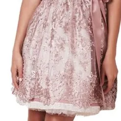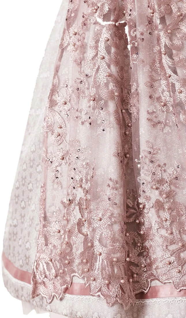 Details schort: transparant, bloemen borduurwerk en afgewerkt met strass steentjes en parels