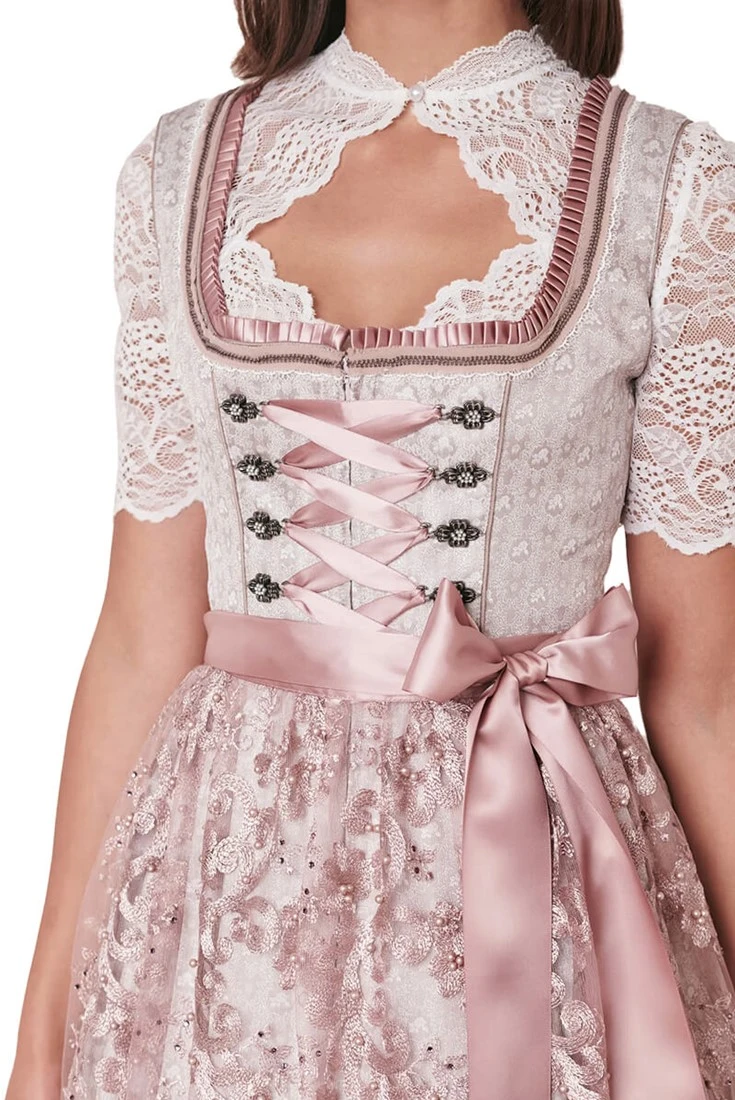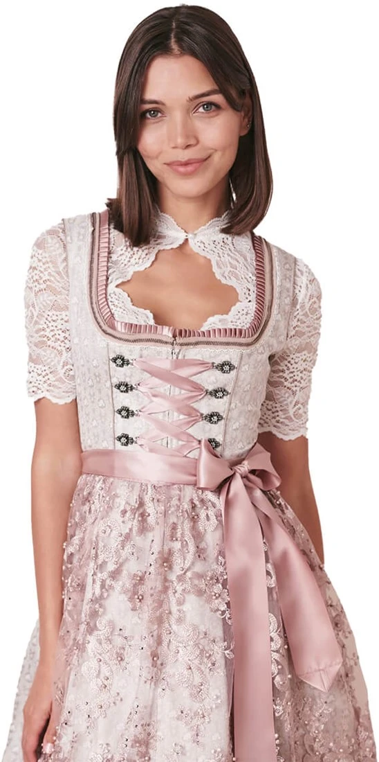 Details dirndl: uitgebreide randen langs een rechte halslijn en miederhaakjes met strass