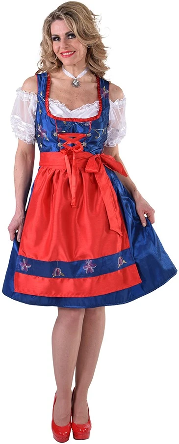 Een leuke blauw/rode dirndl met sierlijke details, een mooi rood schort. Deze dirndl word exclusief de blouse en andere accessoire geleverd (apart verkrijgbaar).