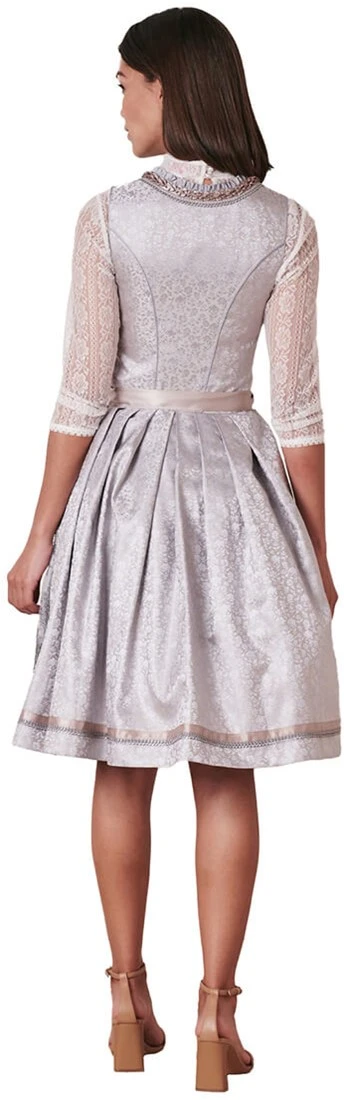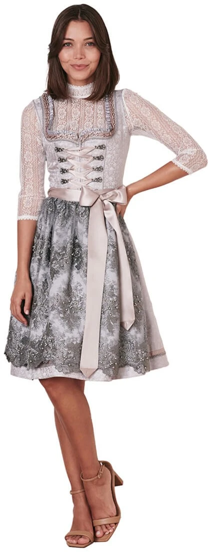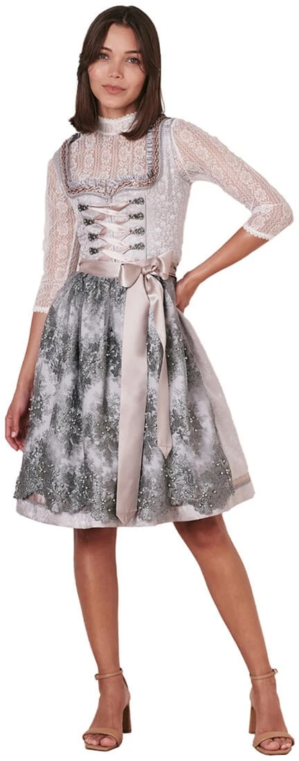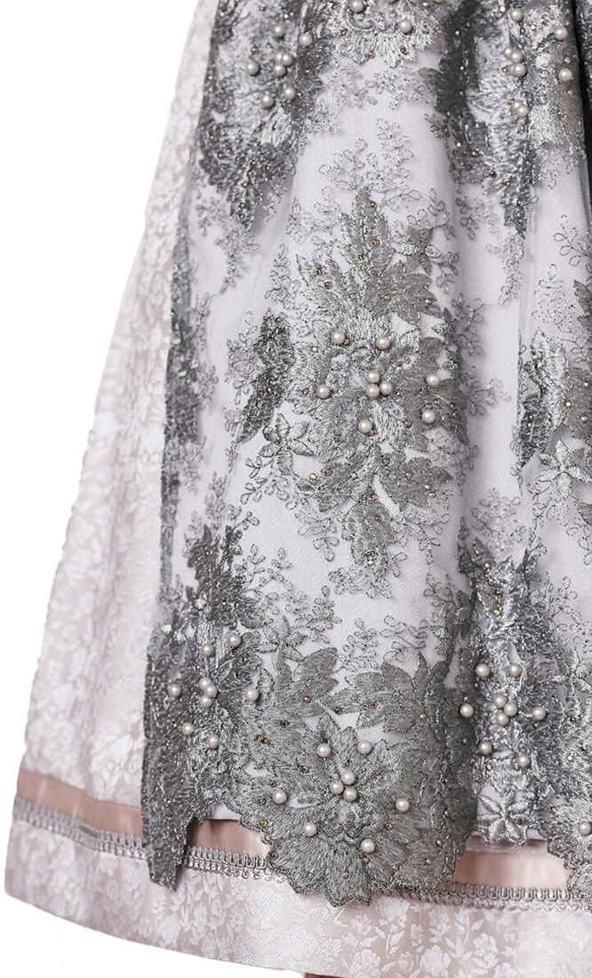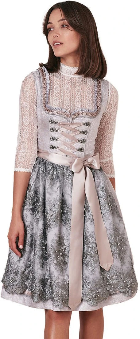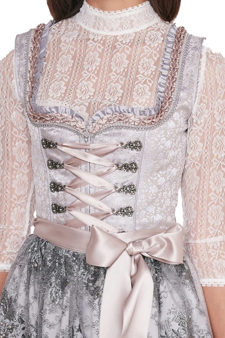 Details dirndl: uitgebreide randen langs een hartvormige halslijn en miederhaakjes met parels