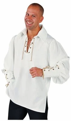 Details: ruim vallend hemd met op de borst en mouwen een veter sluiting