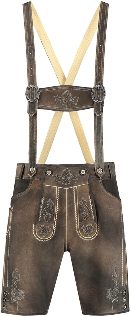 Deze korte lederhose komt tot boven de knie en heeft een verouderde look voor een authentiek gevoel. Een mooie blikvanger op een oktoberfest.