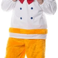 Eenden kostuum voor heren, bestaande uit een broek van pluche, en een bovendeel met capuchon. Bijpassend damesjurkje ook verkrijgbaar.