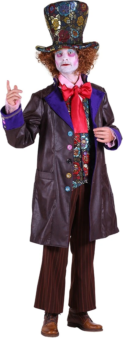 Fan van de film Alice in Wonderland? Ga dan verkleed als het personage “Mad Hatter”! De bruine jas heeft een lederlook en de uiteinden van de mouwen en kraag zijn voorzien van een paarse velours stof en glitterende details. Het gilet en de grote hoed hebben een mooie bloemenprint met metallic glans. De roze satijnen blouse heeft aan de uiteinden van de mouwen een kanten rand en is bevestigd aan het gilet. Het kostuum is voorzien van vrolijke gekleurde knopen. Alles is gemaakt van 100% polyester. Dit prachtige kostuum bestaat uit: