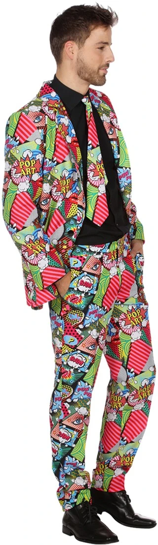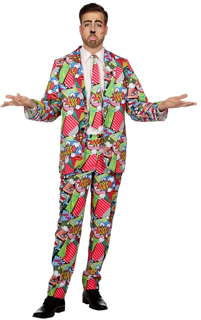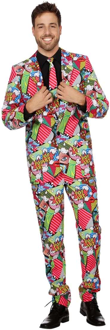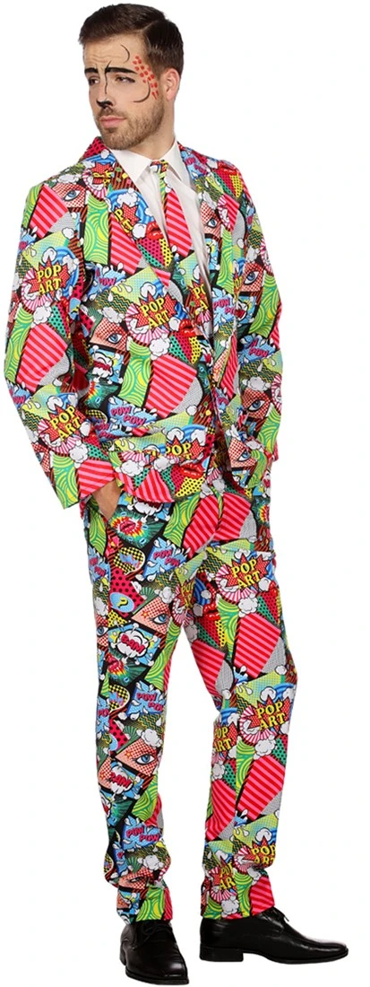 Met dit vrolijke kostuum val jij wel op tussen alle partygangers! Het kostuum met knipselkrant figuren is in stijl van de Pop Art uit de jaren 50. Met de verschillende teksten en afbeeldingen trek jij zeker wel de aandacht.