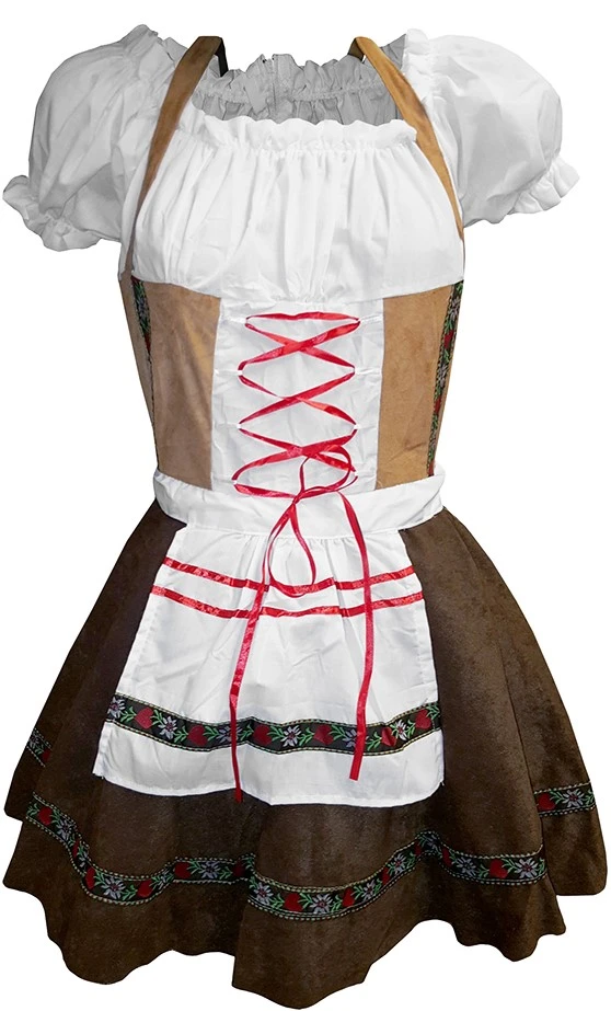 Een korte dirndl met een bruine korte rok. Deze dirndl is gemaakt uit 1 gedeelte en wordt dus inclusief de blouse geleverd. Onder de rok zit een ingenaaide petticoat. Achterop zit een rits, daarmee is de Tiroler dirndl dicht te maken. Ook verkrijgbaar met een groene rok.