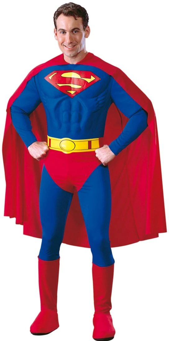 Met dit luxe kostuum ben jij net Superman! Het pak bestaat uit de jumpsuit met gespierde borst, de cape en de beenkappen.