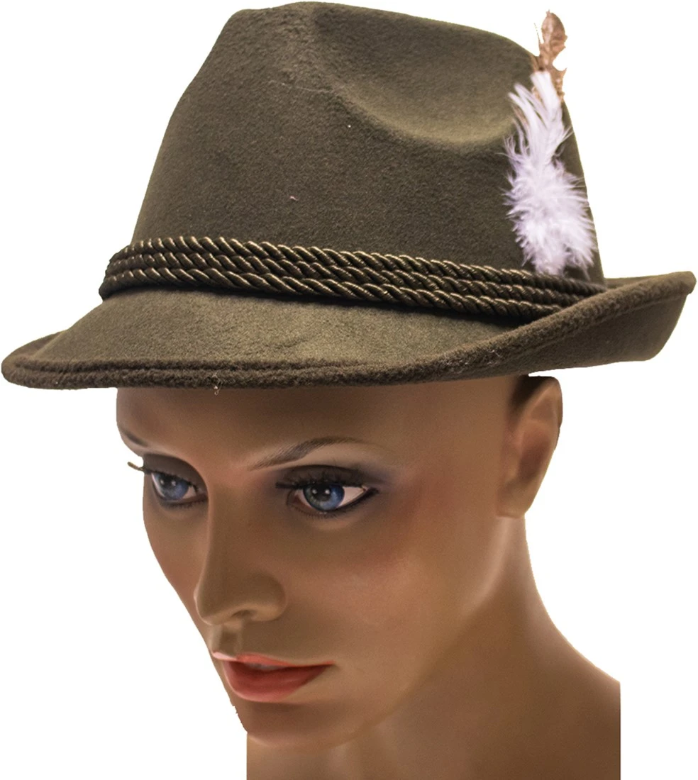 Details: 3 donkergroene touwen om de hoed en aan de linkerkant een veer