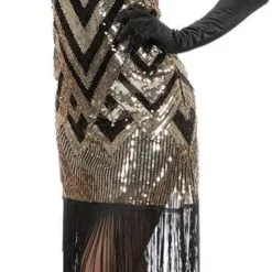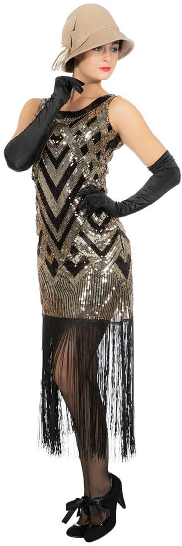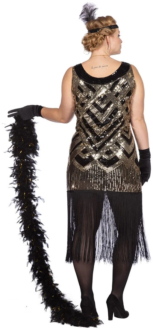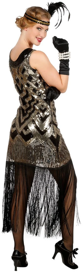 Kenmerken:Een doorzichtig jurkje met zwarte en zilverkleurige pailletten en onderaan het jurkje hangen lange zwarte franjes. Onder het doorzichtige jurkje zit een zwart onderjurkje.