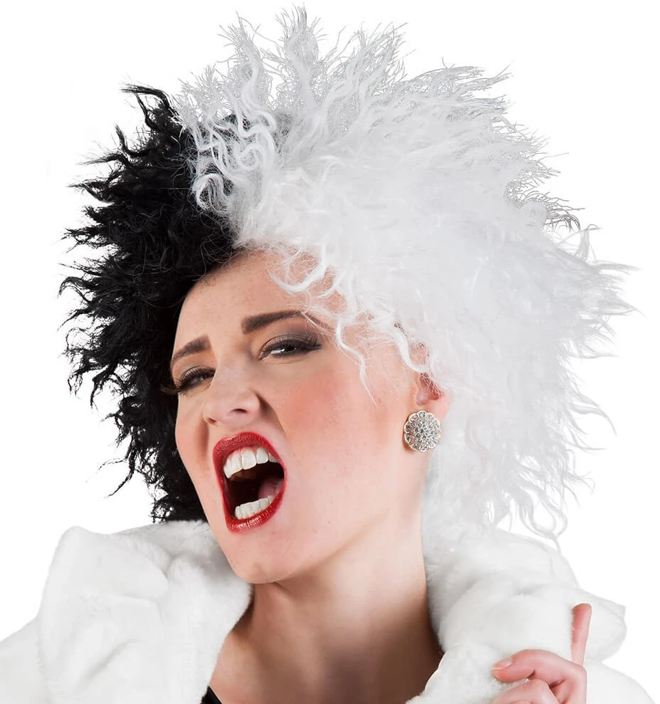 Pruik Cruella. Pruik voor het typetje Cruella de Ville van de Disney film 101 Dalamiers.