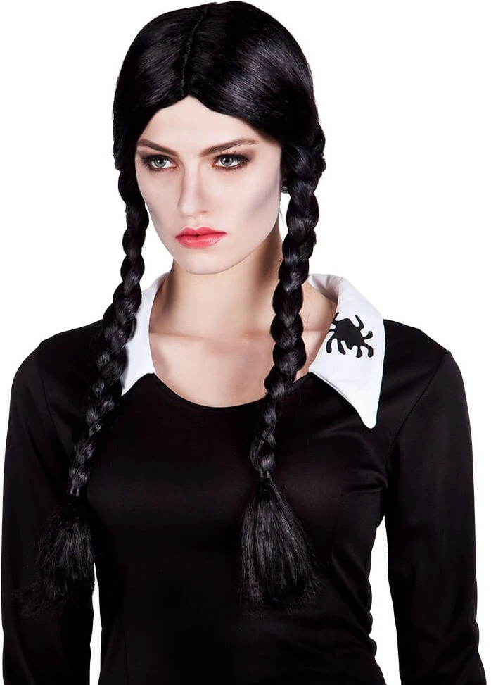 Een mooie pruik voor een sekreetachtig kostuum, ook geschikt voor griezelig schoolmeisje of Wednesday.