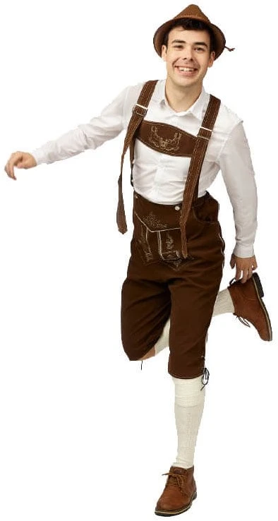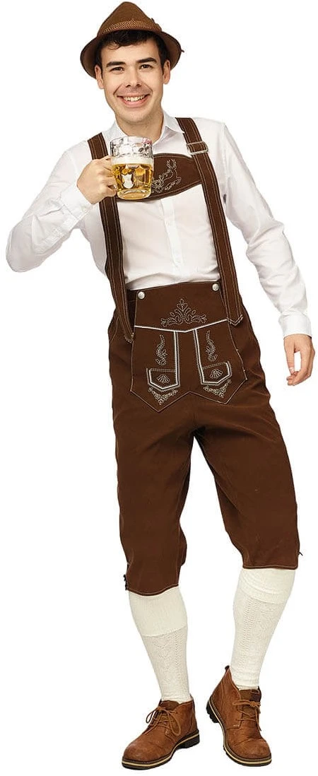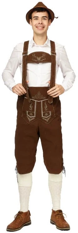 Mooie bruine Tirolerbroek om te dragen met een Oktoberfest! De lederhose heeft meerdere versieringen en subtiele witte strepen.