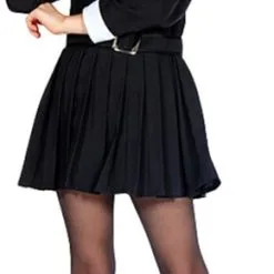 Details: lange mouwen en de kraag, manchetten en knopen zijn wit. Om het middel zit een riem met zilver kleurige gesp en de rok heeft plooien