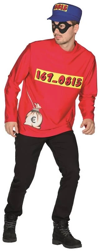 Details shirt: afbeelding van een gevangenisnummer en geldbuidel